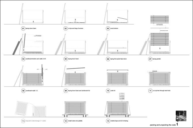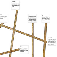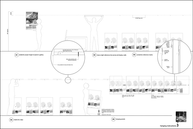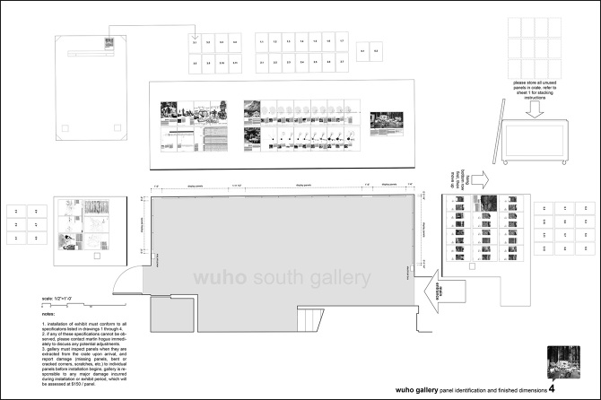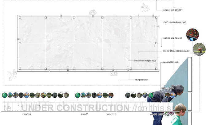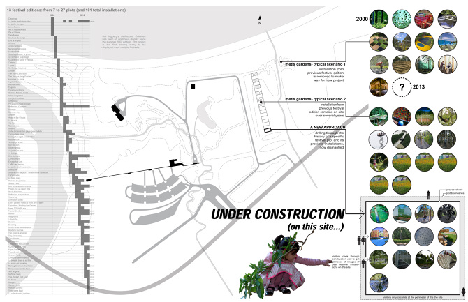An entry submitted to the Metis International Gardens Festival on the Northern shore of the St-Lawrence River, Under Construction / On this site examines the cycle of installation and dismantling of gardens around the festival grounds. Each year visitors experience new projects as well as others that remain on the grounds for extended periods of time. Returning visitors may also recall past projects that have now been taken down. With its temporary plywood construction fencing blocking access to the site, the installation allows curious onlookers to drill through the history of a specific garden plot on the Metis festival grounds and peek at a photographic inventory of projects installed there since the first edition in 2000.