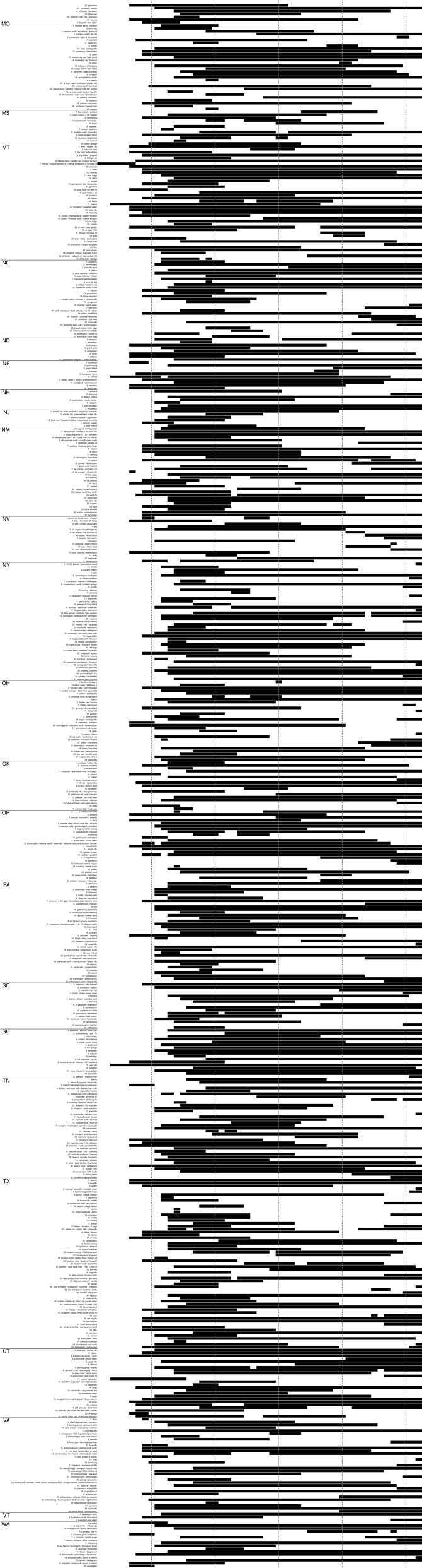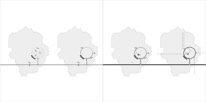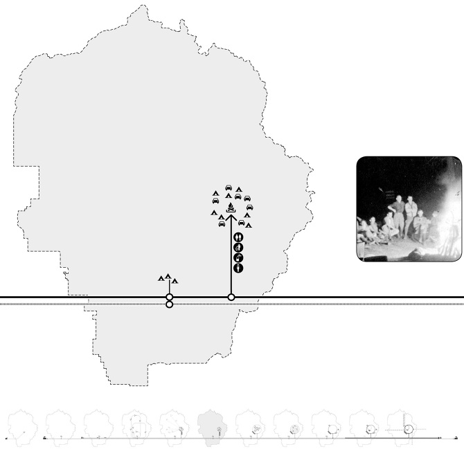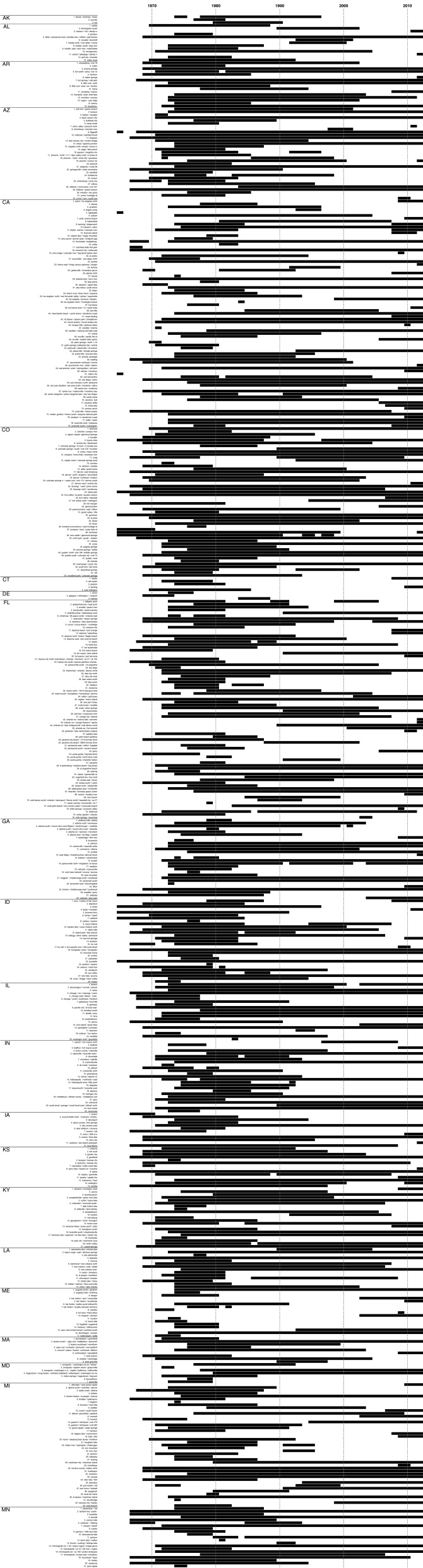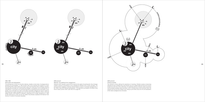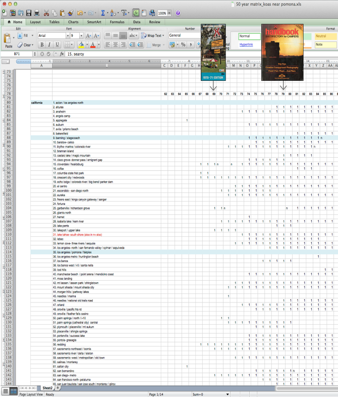 Behind KOA's highly visible and successful brand lies an uncomfortable fact—that nearly two-thirds of the facilities ever opened by the camping giant are now closed. Using the campground directories issued annually by KOA, I was able to reconstittue a precise timeline for no less than 1,158 individual facilities over the company's entire history. converting the Excel spreadsheet to a drawing, the timeline foregrounds the highly unstable nature of the camping business, which, unlike national and state parks, remains subject to land values, gas prices, and other key economic indicators.