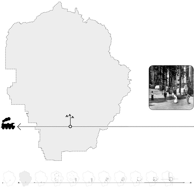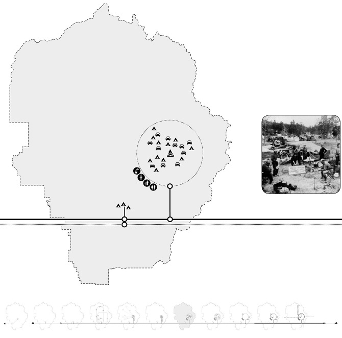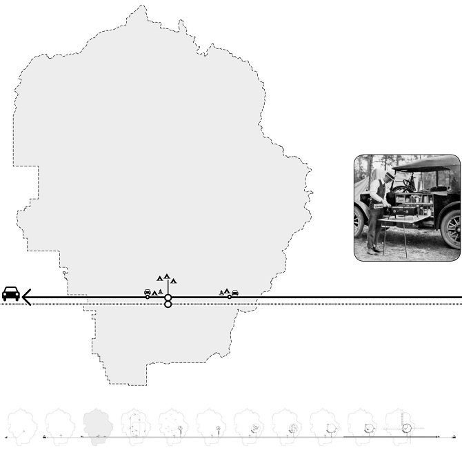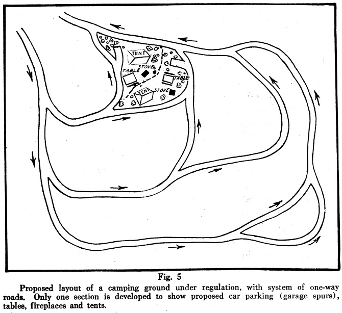 Expressing concern about the steady degradation of ecologically sensitive areas in national parks, plant pathologist Emilio Meinecke is the first to codify the potentially destructive role of the automobile: “Man injures only those smaller plants he actually tramples under foot. The car, much clumsier to handle, crushes shrubs and sideswipes trees, tracing off living bark and severely injuring them. Oil, a deadly poison to plants, drips from the parked automobile.” Meinecke's enduring contribution to campground design is to expand the organizational system of the campground to integrate vehicular traffic. He proposes one-way loop roads that lead automobiles to individual parking spurs next to each campsite. In this light, the plot is as much about accommodating the automobile in the landscape as it is about establishing a territory for the camper.