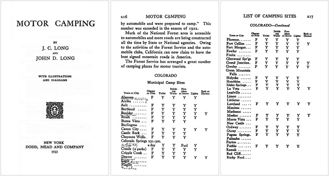 Looking back on Yosemite’s early campgrounds, Stanford Demars observed that “it was commonly joked—and not without some truth—that the first camper to drive his automobile out of the campground on a holiday morning was likely to dismantle half of the campground in the process due to the common practice of securing tent lines to the handiest object available—including automobile bumpers.” The concept of individually allotted sites originates with large facilities such as Denver’s Overland Park (1917–1930). Spanning 160 acres along the Platte River, the campground built a national following by offering a range of attractions that becomes the envy of municipal campgrounds nationwide. Its reputation as the “Manhattan of auto camps” owes to its grid of 800 individual lots that collectively can accommodate up to 6,000 autocampers each night. The campground is no longer an amorphous gathering of vehicles, tents and cables; rather, this arrangement involves a high degree of spatial organization and sophisticated systems to collect fees, track camping parties, and monitor the length of stays.